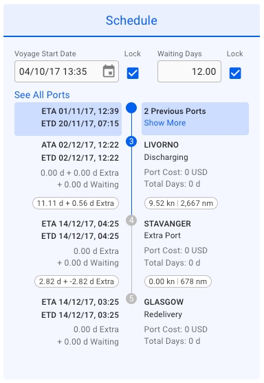 "Show More" is a link that allows you to add up to 5 additional Port Calls per click on the current Voyage's schedule. These added Port Calls will remain visible throughout the system unless the voyage is reopened.