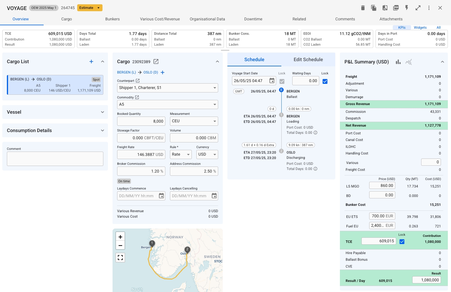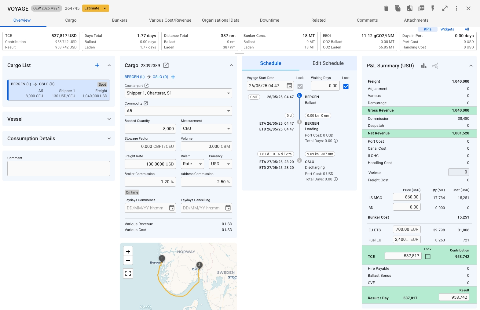 The summary section displays all cost/revenue items, including fuel consumption and price, related to either cargo, voyage, or port call. This breakdown displays different figures for Voyage Charter and Time Charter estimates.