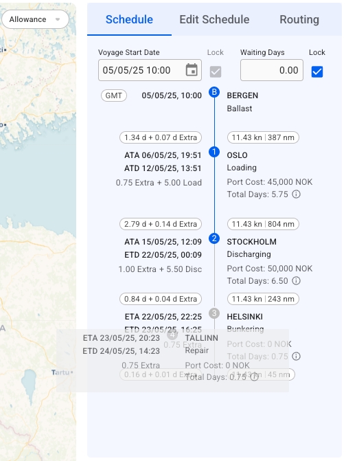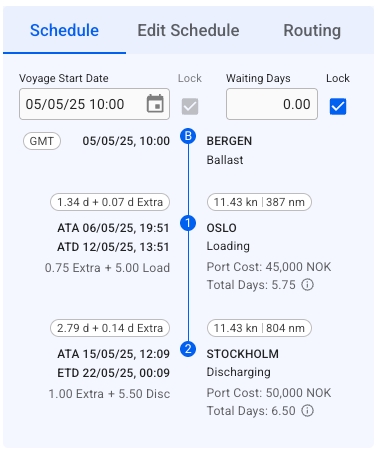 This section is highly customizable: for example, you can change the voyage start date, lock it, update the port call sequence, and edit port calls by hovering over a port call box.