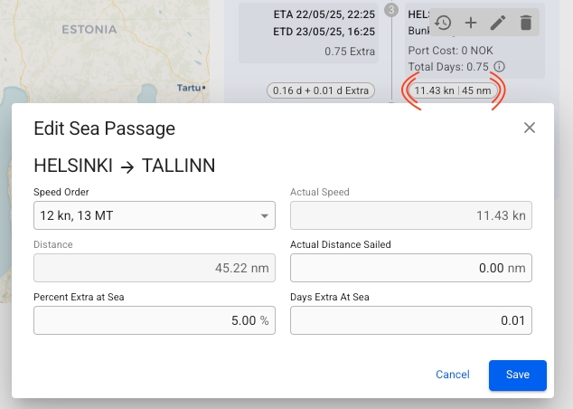 To edit a port call in the schedule, click the pencil icon in the action tooltip. A popup modal then shows with editable essential port call details (Figure 5).