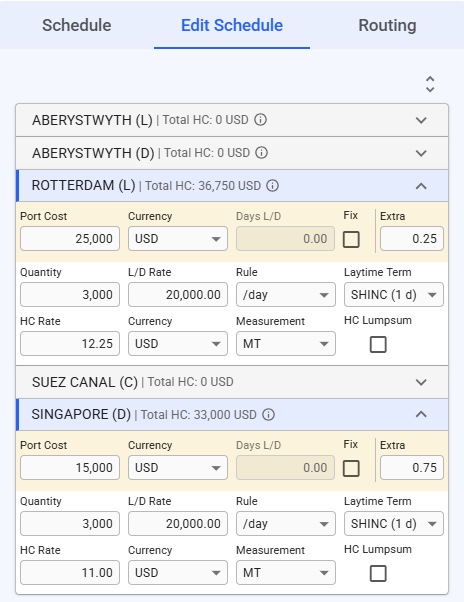 The first row, in yellow highlight, you can find the Port Call's Port Cost, Currency, Days L/D, Fix checkbox and Extra (days in port).