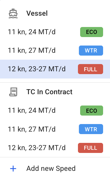 The dropdown initially includes speed options from the vessel and TC In contract configurations relevant to the selected passage. Speeds are grouped by source and labeled with a speed category chip (if applied).