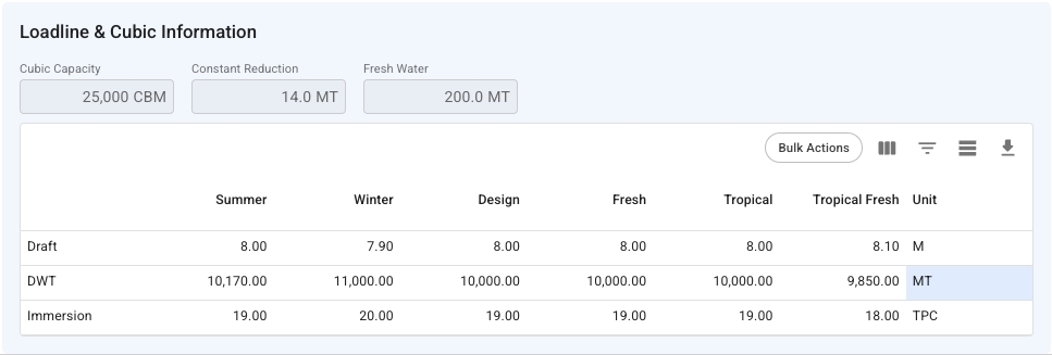 In the bottom of the Intake Calculator, you will find a section outlining the loadline and cubic information of the vessel. This section is for reference only.