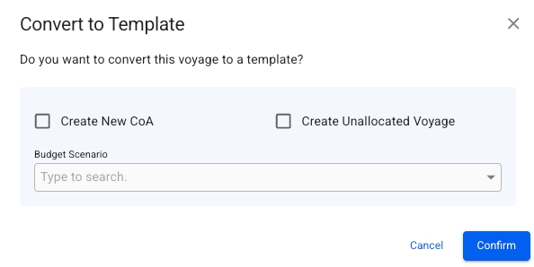 CoA - both options will be available and the 'Create New CoA' option is selected by default. If deselecting this option, the template voyage will continue to use the old CoA instead of creating a new.