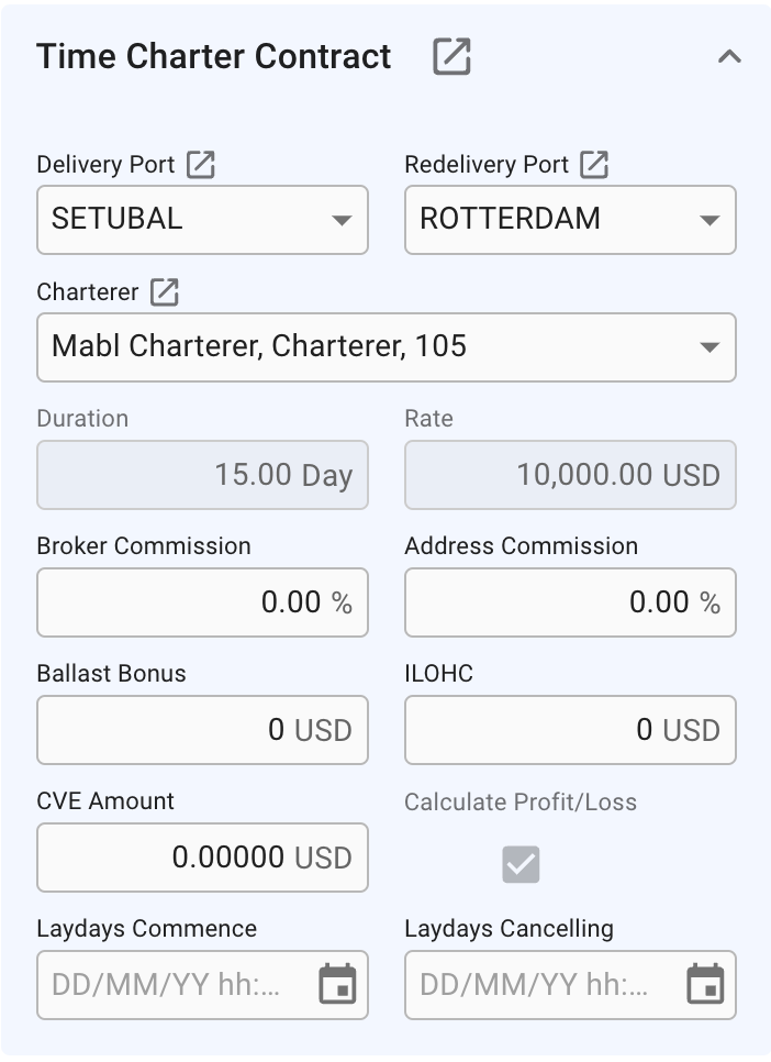 A TC Voyage will not have a Cargo Section on the Overview Tab like normal Voyages, but instead have a Time Charter Contract Section displaying the Time Charter Contract. In this section you can edit the most important fields on a Time Charter directly through the Voyage Drawer or click the