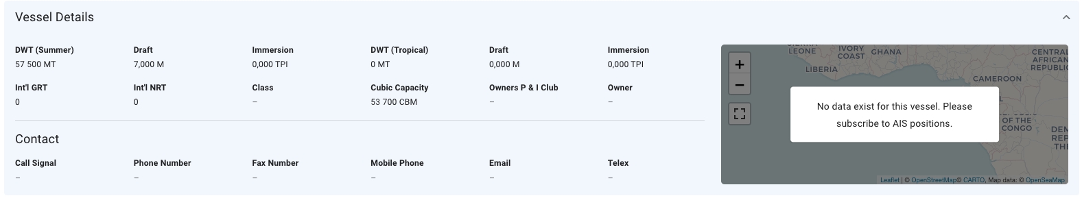 The "Vessel Details" section shows some key data points about the vessel such as DWT, Cubic Capacity, Draft and more. Click Expandto show more details and contact information for the vessel.