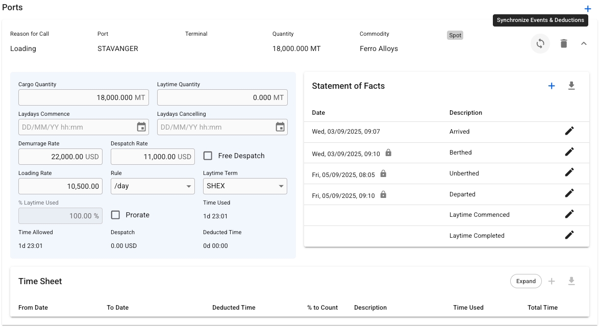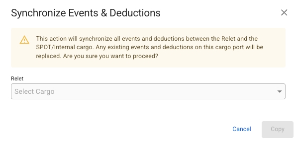 In the Cargo Port Panel List, a Synchronize Events and Deductions button will be available for all relet, internal and corresponding spot cargo ports.