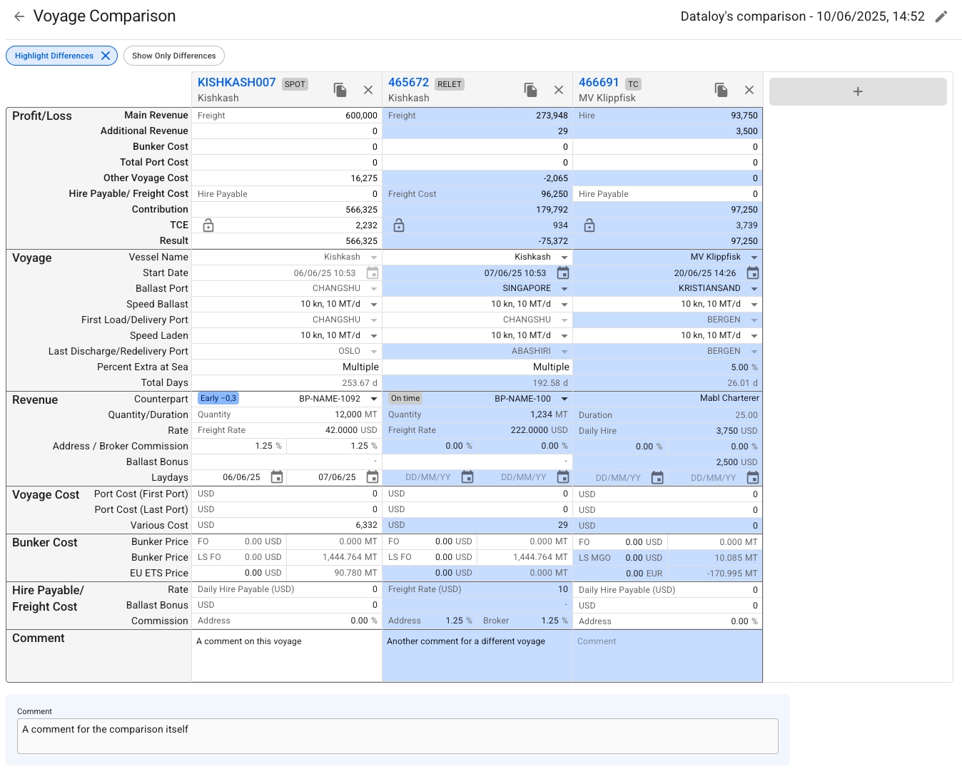 Add new voyages to the comparison by using the big grey button in the right-most column. This will open a dropdown, allowing you to add an existing voyage in the system, or create a brand new one.